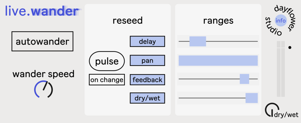 As live.wander meanders through user-defined but nonetheless randomized values, it offers a distinctly generative flavor. If you've ever wanted to push the concept of delay to its extremes, live.wander is for you!